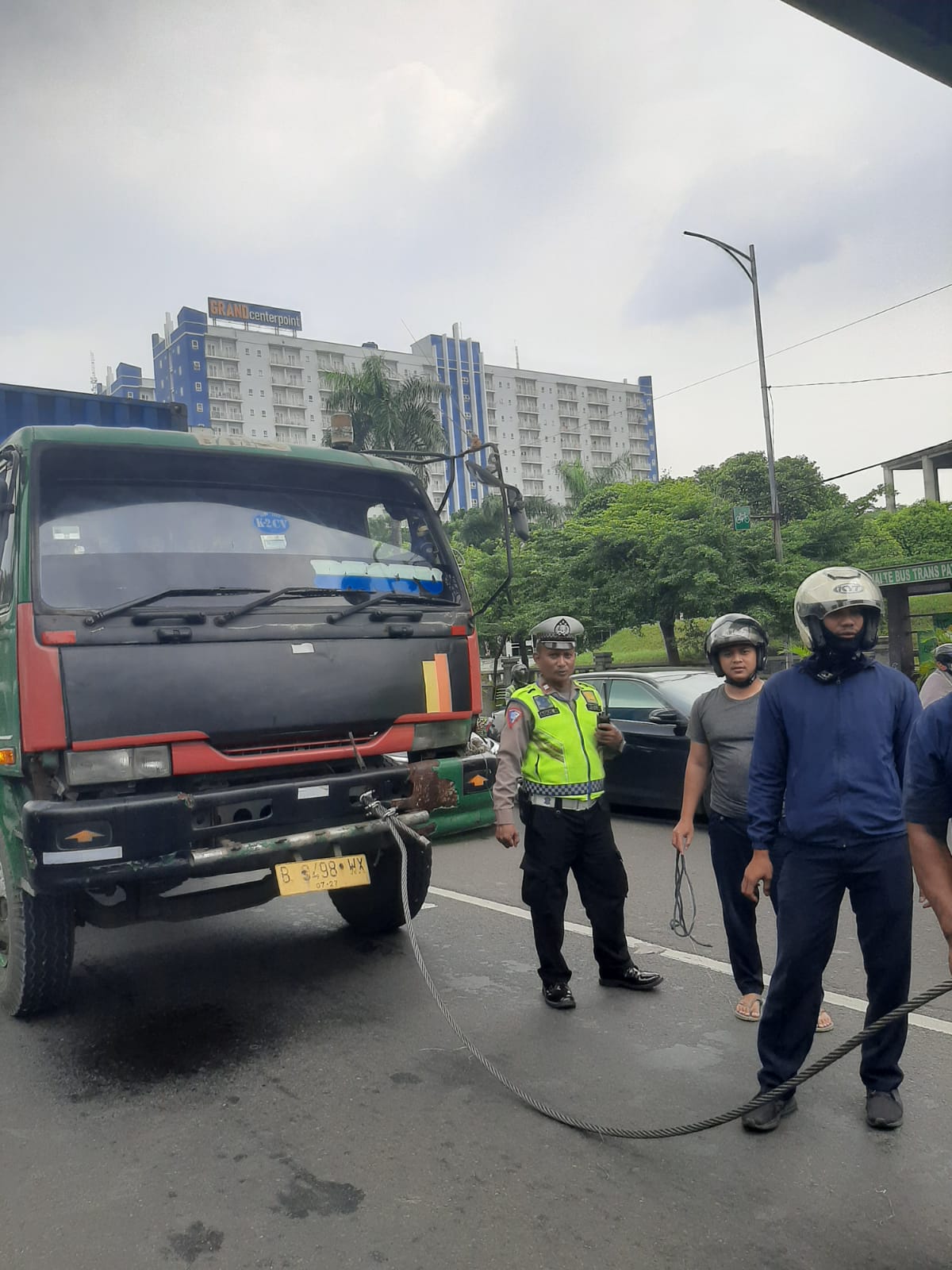 Kedua anggota Satlantas Polres Polres Metro Bekasi Kota kemudian melaksanakan gatur lalin akibat dari proses evakuasi truck dengan meminta bantuan truck lain yang kapasitas mesin besar untuk melakukan penarikan menggunaka kabel seling.