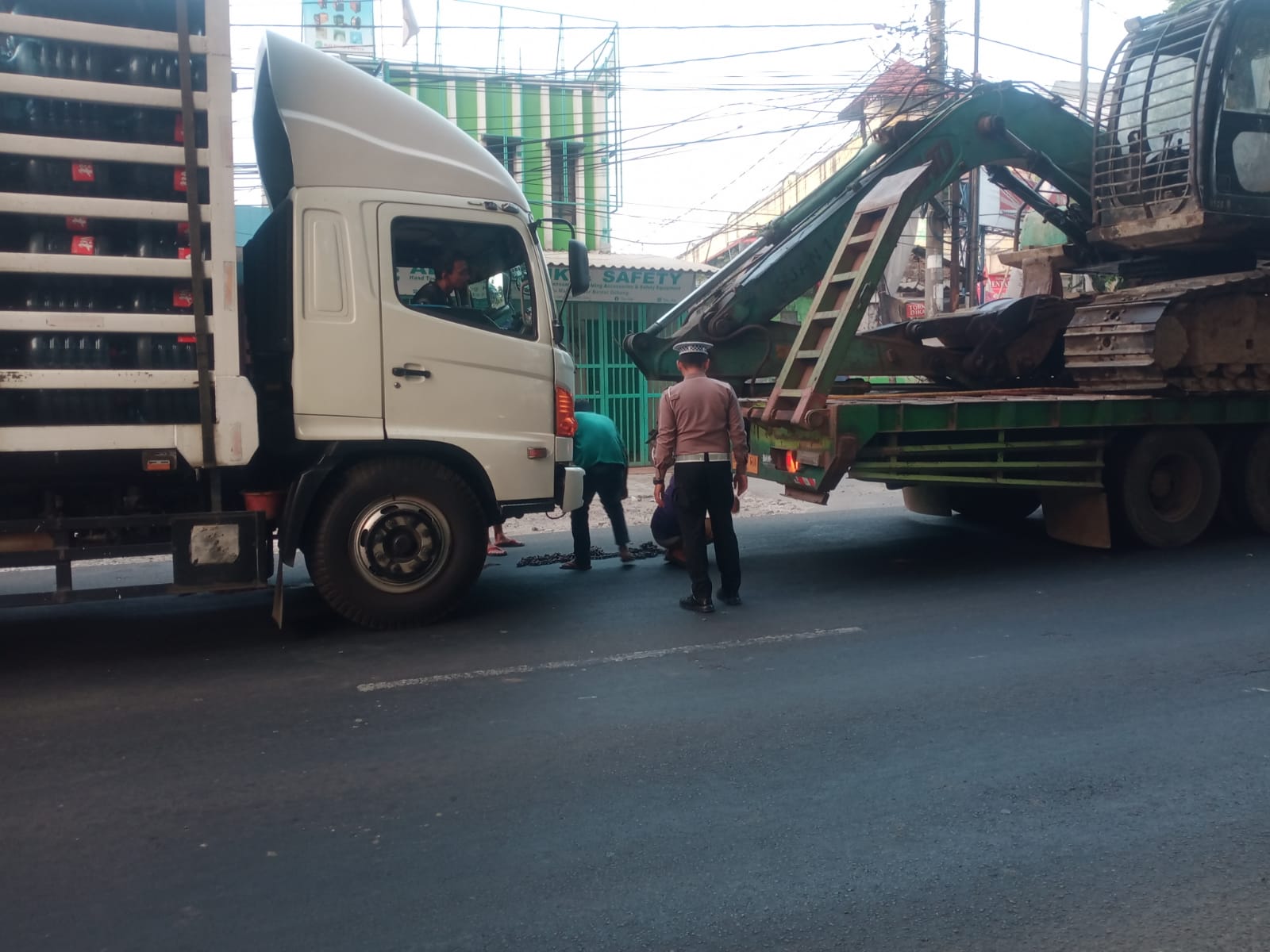 Truk muatan air galon yang mogok di depan Polsek Bantargebang menyebabkan gangguan pada arus lalu lintas. Oleh karena itu, para anggota Unit Laka Lantas Polsek Bantargebang meminta pertolongan kepada truk trailer yang melintas di sekitar lokasi kejadian. Truk trailer tersebut dengan sukarela membantu menarik kendaraan mogok ke bahu jalan, sehingga lalu lintas dapat kembali lancar.