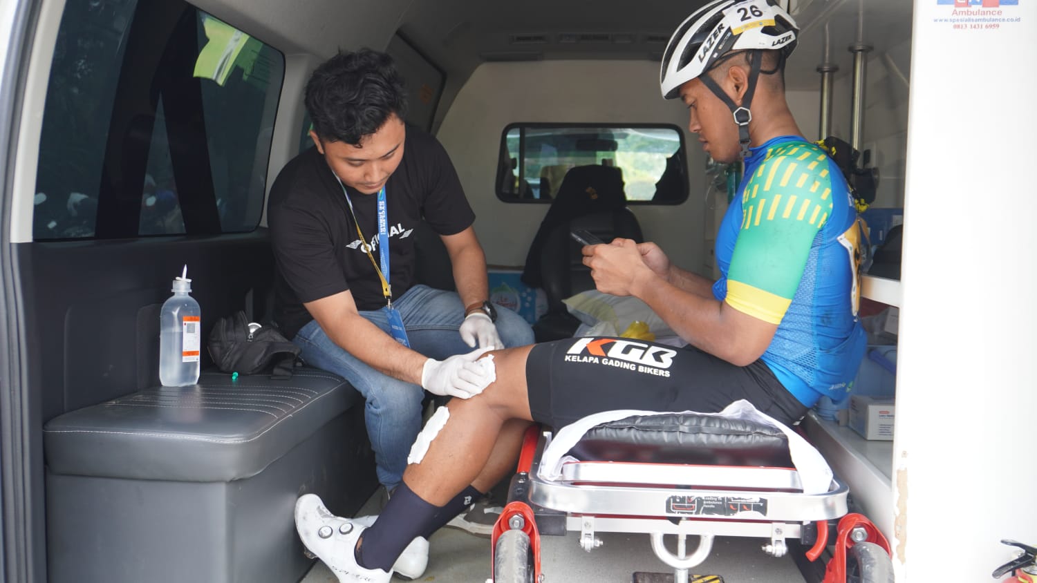 “Ada yang mengalami cidera akibat jatuh lalu kami tangani hingga dalam kondisi normal. Sebagian peserta lainnya mengalami kram otot dan nyeri. Untuk hal yang fatal, tidak ada. Mungkin karena mereka adalah atlet sehingga stamina mereka secara dominan terjaga dengan baik sehingga hal fatal seperti serangan jantung atau henti jantung mendadak tidak kami temui selama perjalanan, “pungkas dr. Samuel Andika yang ditemani perawat Aziz Alfarizi untuk ikut membantu penanganan kepada atlet yang cidera.