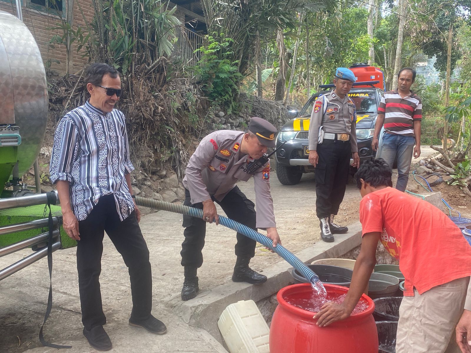 Dalam kegiatan ini, hadir beberapa pejabat penting antara lain Sujatmiko, S.Sos., Camat Bendungan, dan Iptu Suswanto, S.H., Ps. Kapolsek Bendungan bersama empat personel Polsek Bendungan. Kepala Desa Srabah, Saifudin, beserta perangkat desa juga turut serta mendampingi distribusi air kepada warga.