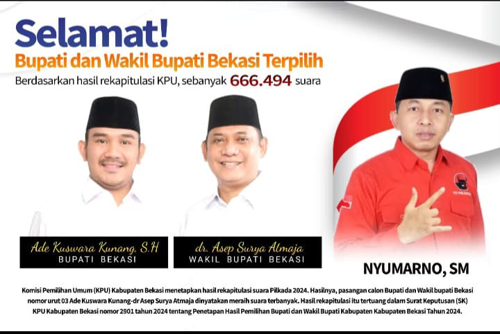 Komisi Pemilihan Umum Kabupaten Bekasi telah menetapkan pasangan calon Bupati dan Wakil Bupati Bekasi nomor urut 3, Ade Kuswara – dr. Asep Surya Atmaja meraih suara terbanyak Pilkada 2024 berdasarkan hasil rekapitulasi rapat pleno terbuka penghitungan suara”.