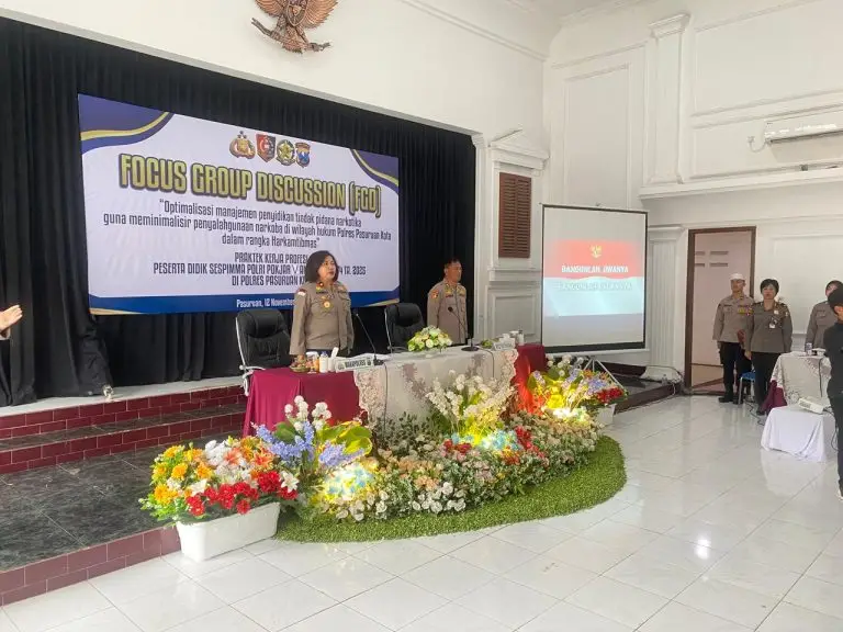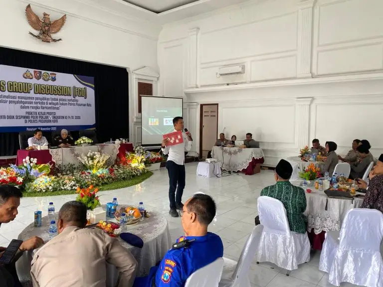Polresta Pasuruan ,dailyindonesia.co – Dalam rangkaian kegiatan Praktek Kerja Profesi (PKP), peserta didik Sekolah Staf dan Pimpinan Pertama (Sespimma) Polri Pokja V Angkatan ke-74 Tahun Anggaran 2025 menggelar kegiatan Focus Group Discussion (FGD) bertema “Optimalisasi Manajemen Penyidikan Tindak Pidana Narkotika Guna Meminimalisir Penyalahgunaan Narkoba di Wilayah Hukum Polres Pasuruan Kota dalam Rangka Harkamtibmas.” Rabu (12/11/2025).