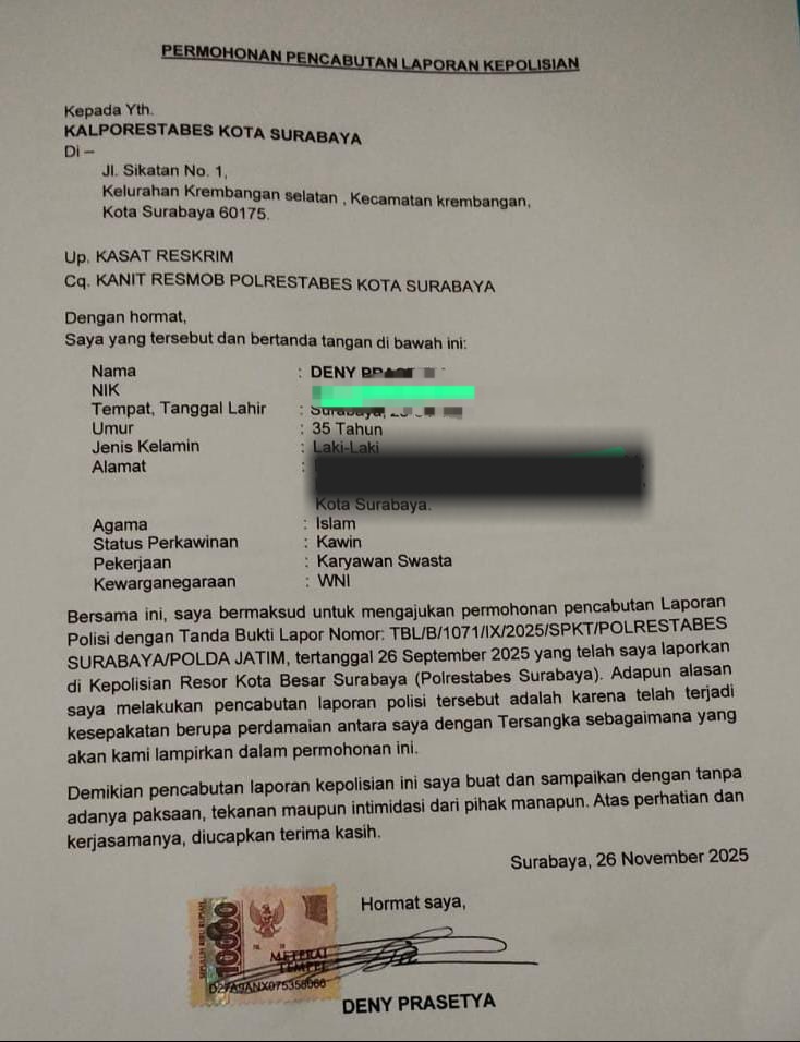 Kemudian tertanggal 26 November 2025, Deny sebagai pelapor membuat Surat Permohonan Pencabutan Laporan Polisi nya di atas Materai 10 ribu dengan melampirkan surat perdamaian yang dilayangkan ke Kasat Reskrim Cq. Kanit Resmob Polrestabes Surabaya.