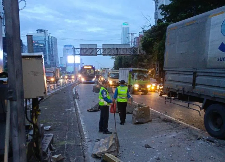 Kronologis kejadian menunjukkan bahwa truk yang melaju dari arah barat menuju timur diduga kurang konsentrasi dan hati-hati saat melewati lokasi kejadian, sehingga menabrak separator beton yang memisahkan jalur Busway. Akibat kecelakaan tersebut, kendaraan mengalami kerusakan material, namun tidak menimbulkan korban jiwa maupun luka-luka.