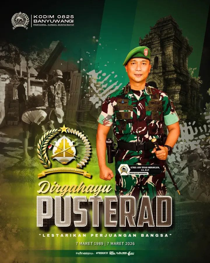 Banyuwangi — Pada 7 Maret 2026, Pusat Teritorial TNI Angkatan Darat ( Pusterad TNI AD ) rayakan HUT Ke-37. Komandan Kodim (Dandim) 0825/Banyuwangi, Letkol Arm Tryadi Indrawijaya, S.H., M.I.P., bersama seluruh keluarga besar Kodim 0825/Banyuwangi menyampaikan ucapan selamat dan apresiasi atas semangat pengabdian prajurit TNI AD,dedikasi dan profesionalisme dalam menjalankan tugas.